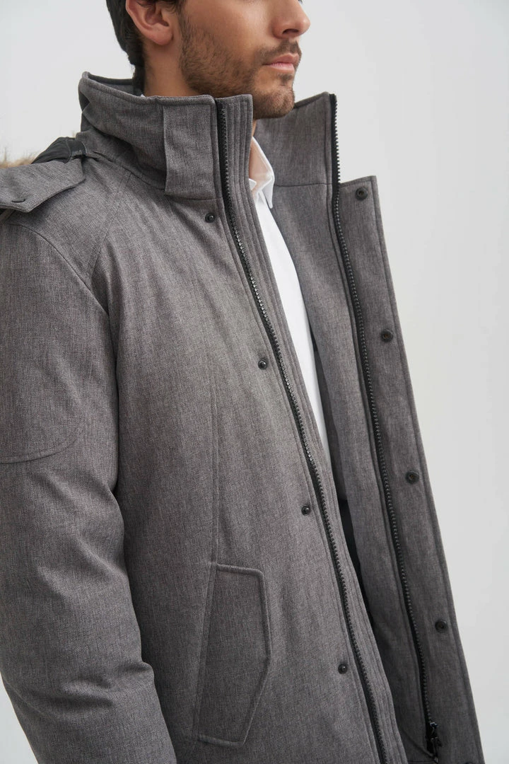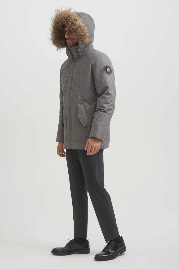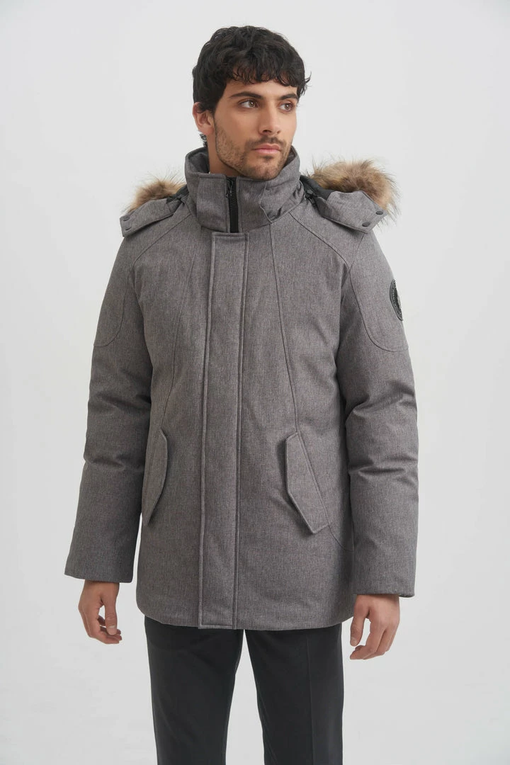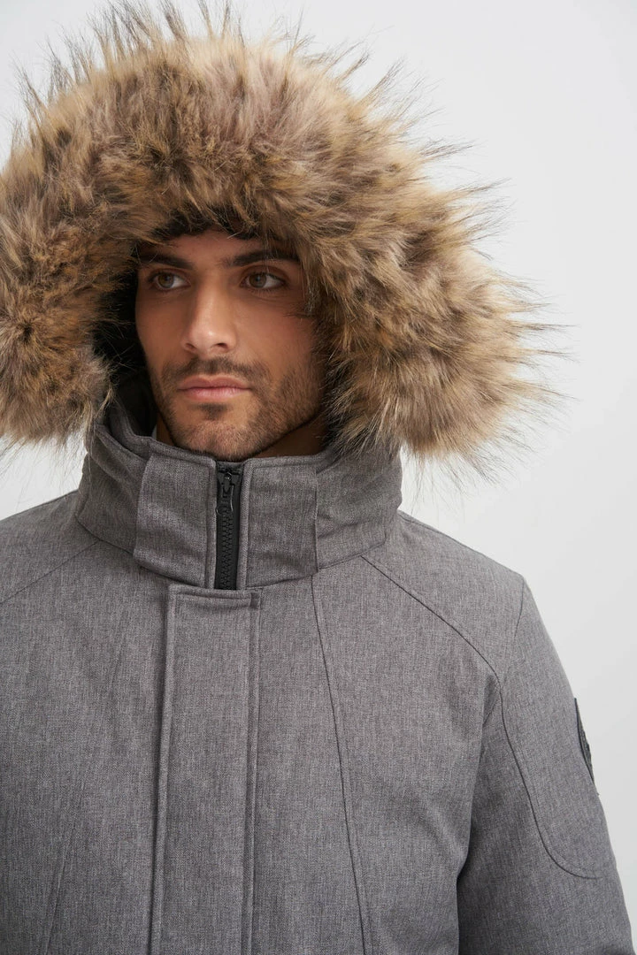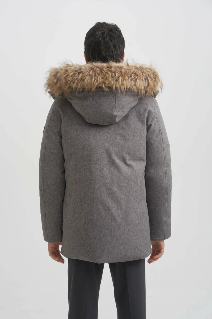 - Detachable hood with removable faux coyote fur trim